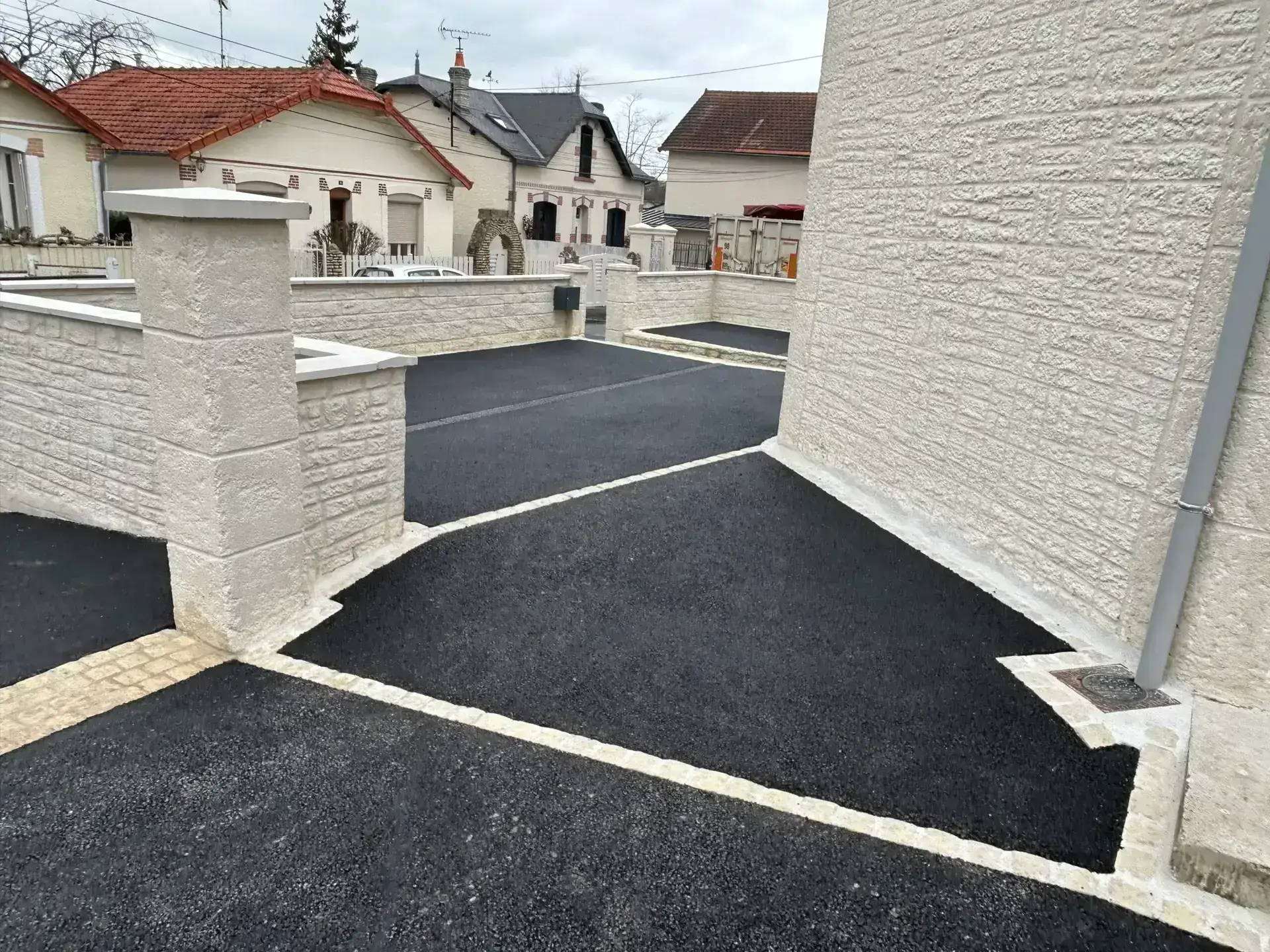 Nous avons ensuite réalisé la pose des pavés et de l’enrobé, en sélectionnant les matériaux en accord avec les souhaits du client. Chaque élément a été installé avec précision pour assurer un rendu esthétique, harmonieux et parfaitement fonctionnel.